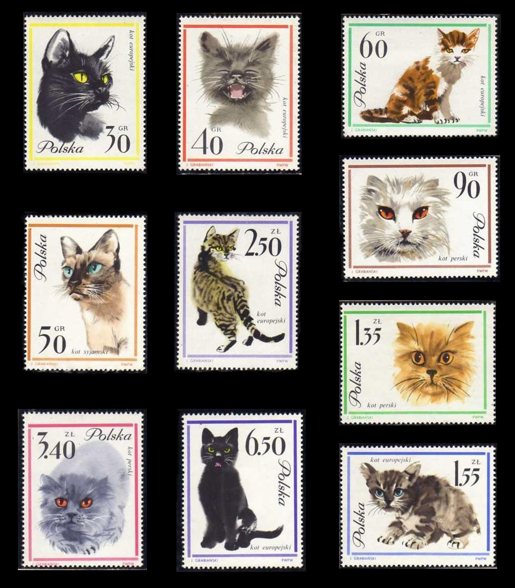 而历史上第一套真正意义上的专门为猫咪设计的邮票,于1964年4月30日在波兰发行,包含10只形态各异、各具特色的猫咪。