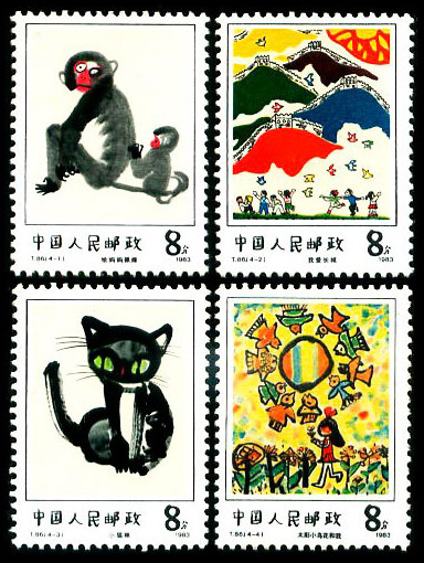 1983年6月1日,为庆祝“六一”国际儿童节发行的T86《儿童画选》邮票,选取四位小朋友的绘画作品为主图,其中第三枚便采用了毛南族少年谭阿西描绘的黑猫形象。