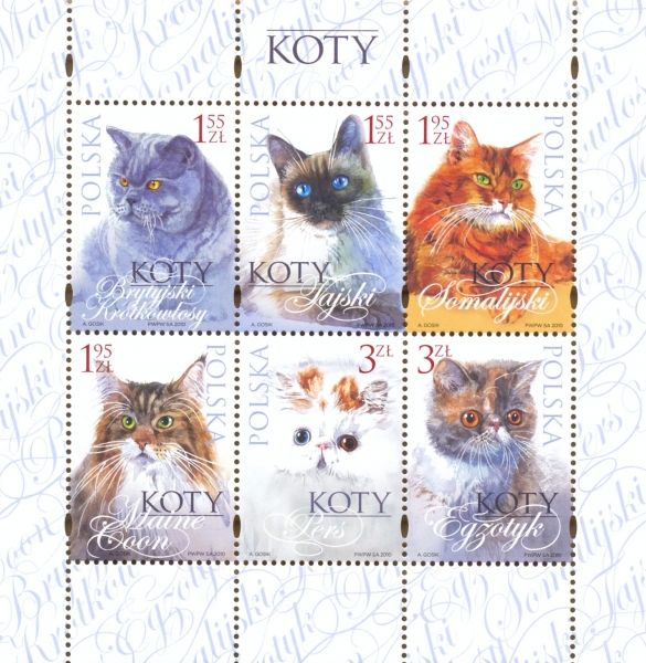 2010年2月17日,波兰又以小全张形式发行了一套共6枚的《猫》邮票。